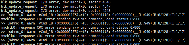 Q3: 公版上使用带 _wifi_ 的配置编译出的image,当sdio卡槽中没有插入SD卡或是挂载SD卡后,执行如 “df -h”的指令后,会有异常log的输出。如图:未插入SD卡时的log; 挂载后执行“df -h”时的log