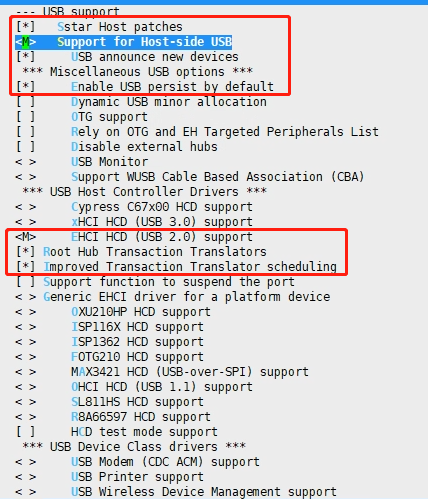 选择上述红框中选项,然后编译出USB 2.0 Host driver:usb-common.ko usbcore.ko ehci-hcd.ko