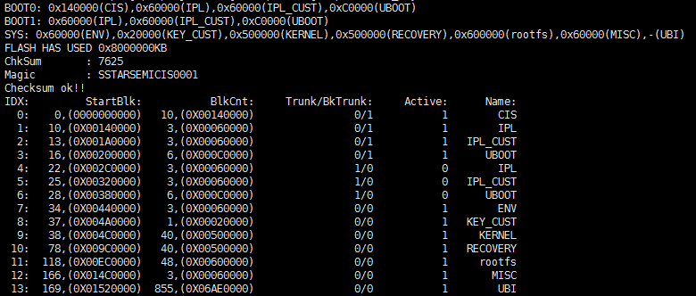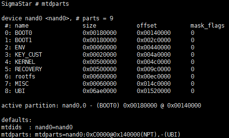 ONE BIN功能是基于ALKAID的打包脚本通过dd命令使BOOT PART分区合并成一个bin,以uboot和linux kernel的角度来看,可以在uboot中输入命令mtdpart看到当前的分区规划,与pni不同的是BOOT PART这部分,整个BOOT PART不再细化内部分区,而是由一个BOOT分区构成:如下图所示: