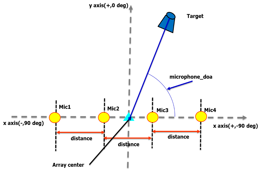 均匀线性数组为一直线排列,且相邻麦克风之间距distance皆相同,并且由于其具有对称性,加强角度仅考虑上半平面(-90度至90度)。图二为均匀线性数组于空间坐标系之示意图。声音方向的角度(microphone_doa)定义为与数组中心及x轴之夹角。逆时钟方向为正。distance 单位为公分,建议至少大于5 cm 或 6 cm。