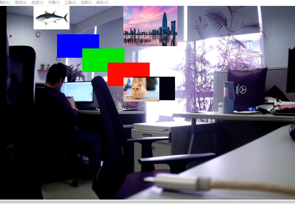 OSD可以显示一张图片,COVER仅仅可以设定颜色,在同一通道上OSD的内容永远在COVER之上,下图在同一个通道上显示了四个cover区域以及三张osd。
