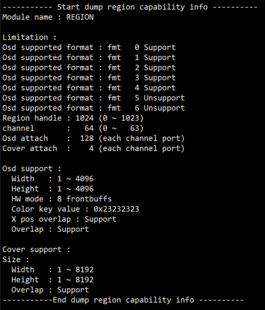 参数 描述 Region capability Region handle 创建region的最大数量为1024个,句柄取值为[0~1023] channel 最大通道数量为64个,通道取值为[0~63] Osd attach 每个输出端口每个通道能绑定的Osd数量上限为128个 Cover attach 每个输出端口每个通道能绑定的Cover数量上限为4个 Overlay Supported Format Osd支持的颜色格式: