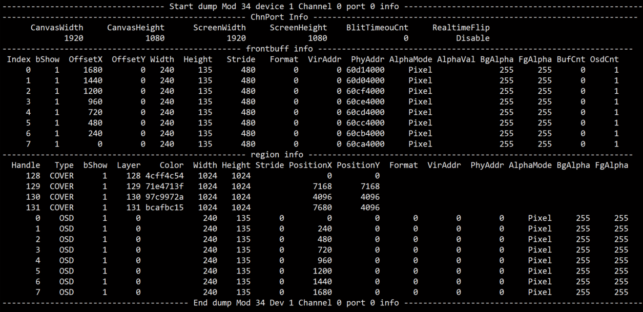 | 举例 | echo dumpFrontBuf 34 1 0 0 /mnt > /proc/mi_modules/mi_rgn/mi_rgn0 在/mnt下产生 Mod34_Dev1_Chn0_Port0_frontbuf0_fmt0_64X48, 表示dump通道为0,输出端口为34号端口,索引为0的frontbuffer的数据,颜色格式为ARGB1555,Stride为64,高为48。 文件格式: Mod[ModId]_Dev[DevId]_Chn[Channel]_Port[Port]_frontbuf[Index]_fmt[Format]_[Stride]X[Height] [ModId] 输出模块号 [DevId] 输出模块的设备号 [Channel] 通道号 [Port] 输出端口 [Index] frontbuffer索引号 [Format] 颜色格式,ARGB1555为0,ARGB4444为1,I2为2,I4为3 [Stride] 宽补齐 [Height] 高 |
