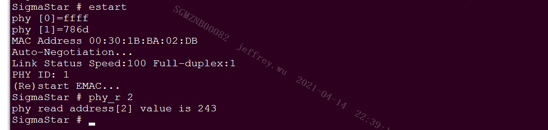 echo phy_r phyAddress > /sys/devices/virtual/mstar/emac0/phyStatusWR echo phy_w phyAddress phyValue > /sys/devices/virtual/mstar/emac0/phyStatusWR