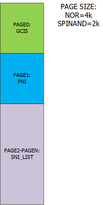上图表示的是CIS数据中的结构,GCIS和PNI由于都小于一个PAGE的大小,因此他们各占一个PAGE的空间,SNI_LIST中由于保存了所有的FLASH信息,它会追加到PAGE1的后面。请注意NOR FLASH和SPINAND FLASH的PAGE大小不一定是2k或者4K,它跟FLASH的规格有关,具体请参考FLASH的SPEC。