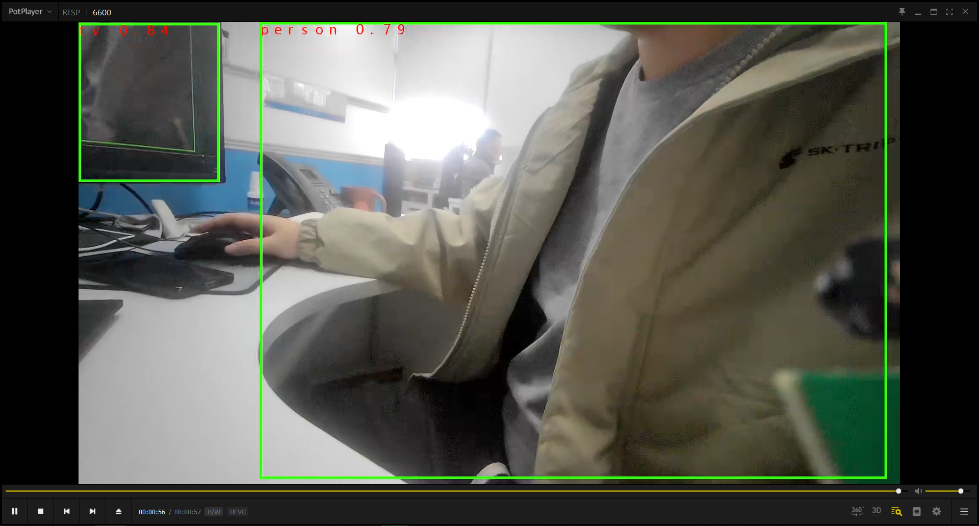 rtsp://192.168.7.2/6600. When playback is successful, you can see the sensor image. Recognized objects in the image will be marked with boxes. Multiple detected objects can be boxed simultaneously, and the detected object names will be marked in red font on the detection boxes.