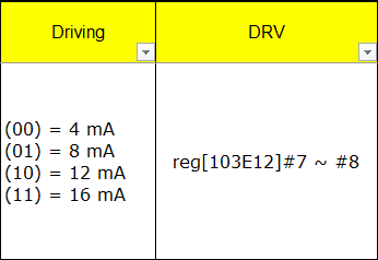 Driving and DRV indicate the driving capability information of the pin. Driving indicates the specific level of the pin's driving capability, while DRV indicates the register needed to adjust the driving capability level. For example, this pin has four driving capabilities of 4mA, 8mA, 12mA, and 16mA, which can be operated through BIT7 and BIT8 of register [103E12].