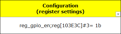 | G | Modify the corresponding bits of con_bit, oen_bit, out_bit, and in_bit based on the value obtained in step F. Note! Do not touch other bits under this offset output-high: con_bit=1, oen_bit=0, out_bit=1 output-low: con_bit=1, oen_bit=0, out_bit=0 input: con_bit=1, oen_bit=1 |