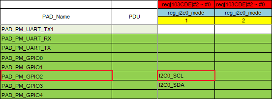 Therefore, you need to pay attention to whether the value of bank: 0x103C offset:0x53's bit[1:0] is 0x2, that is, whether BIT0=0 and BIT1=1. If so, it indicates that I2C1_MODE_2 is currently enabled.
