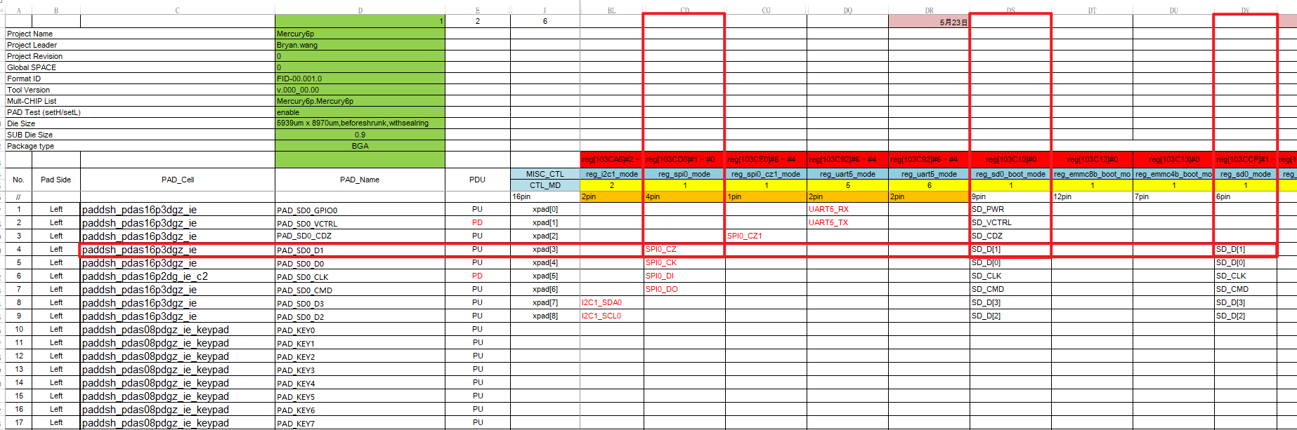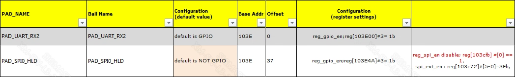 The Configuration (register settings) information involved in process B corresponds to only one register address for most pins, but there are cases where the pin Configuration information corresponds to multiple registers. Specific situations can be queried in the HW checklist, and the overall idea is the same, confirming whether these registers' corresponding bits are enabled.