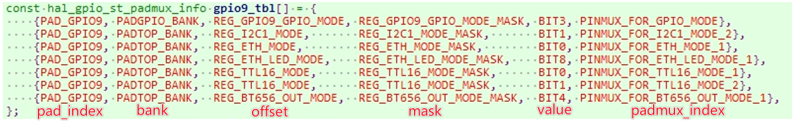 hal_pinmux.c summarizes all the multiplexing functions supported by all pins, which is more intuitive than querying Tmux_Table, as it allows direct access to the registers of the multiplexing functions supported by the pin.