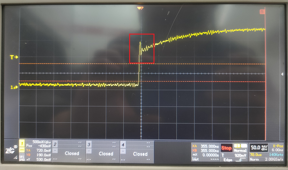 The phenomenon in the figure above is caused by the SCL using the one push function. The half high level is caused by one push; normally, it would continue to push high, but some hardware may have strong external interference, and after one push, it cannot continue to push high, resulting in a drop that causes a short pulse. You can directly disable the one push function by manipulating the registers, for example, for I2C bus0: