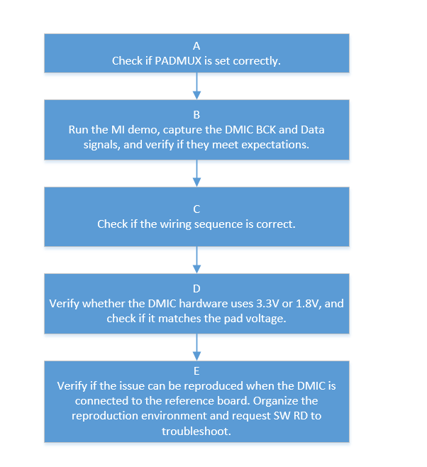 | D | Confirm whether DMIC hardware is 3.3V or 1.8V, and confirm whether the currently selected pad is 3.3V or 1.8V; voltages must match | Exit Condition 1: 1. Voltage matches Exit Condition 2: 2. Voltage does not match |