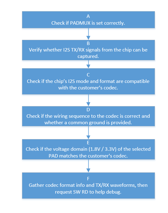 | E | Confirm whether the voltage domain 1.8V/3.3V of the selected pad matches the customer codec | Exit Condition 1: Voltage matches Exit Condition 2: Voltage does not match |