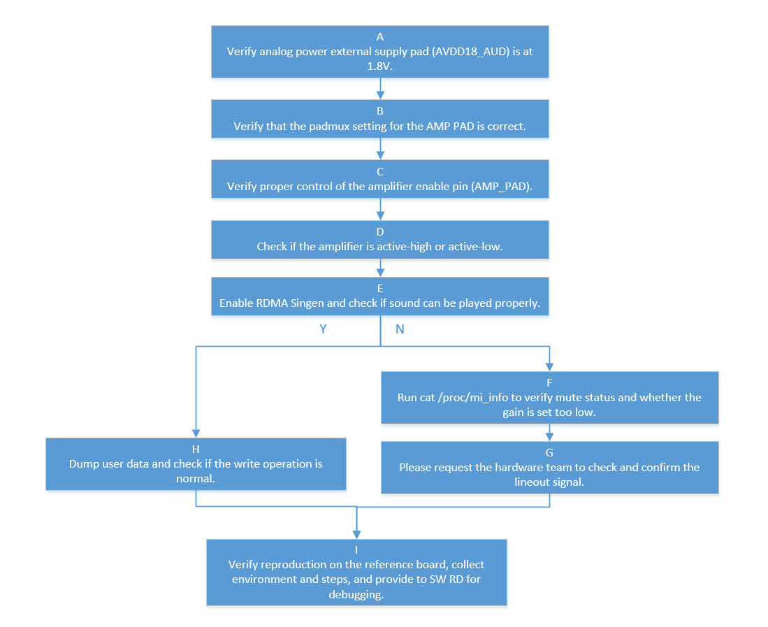 | B | Confirm whether the AMP pad padmux setting corresponds to the board (verify if the amp pad on the EVB schematic matches the amp pad in padmux.dtis) | Exit Condition 1: 1. Pad configuration is correct Exit Condition 2: 2. Pad does not match the board |