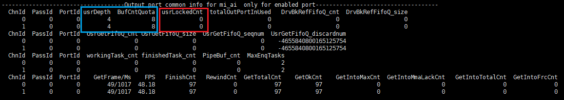 Confirm the application buffer retrieval status. usrLockedCnt indicates the number of buffers held by the application without being released. If usrLockedCnt equals usrDepth, it indicates that the application has acquired all available output buffers.
