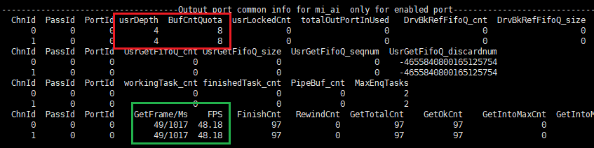 - Confirm the output buffer configuration. usrDepth and BufCntQuota represent the number of buffers available to the application and the total number of buffers respectively. Check whether usrDepth and BufCntQuota are too small, causing buffer retrieval by the application to affect normal AI thread operation.
