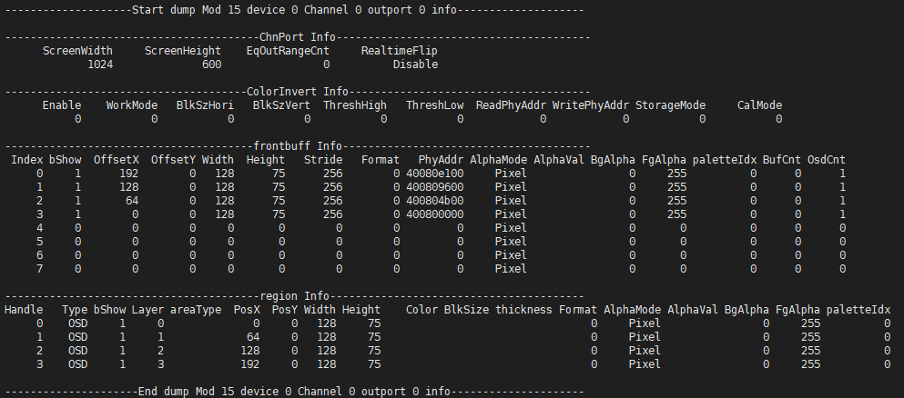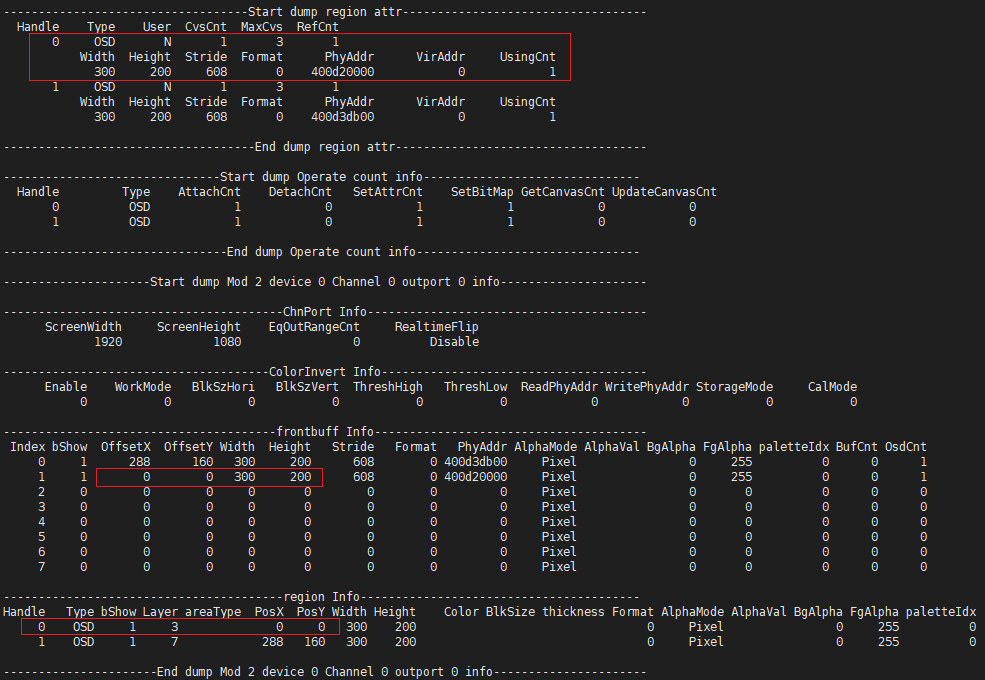 In the "region Info" list of Mod 2 device 0 Channel 0 outport 0 info, only the OSD with handle 0 has both "PosX" and "PosY" attributes equal to 0, which can confirm the handle ID of the problematic OSD is 0;
