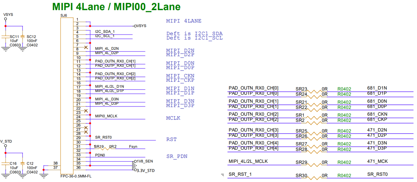 The schematic diagram for the 4-lane connection of snr0 on the Comake_Pi_D2 is shown below. The 4-lane configuration is compatible with 2-lane. As illustrated, snr0 is connected to the SJ6 connector: