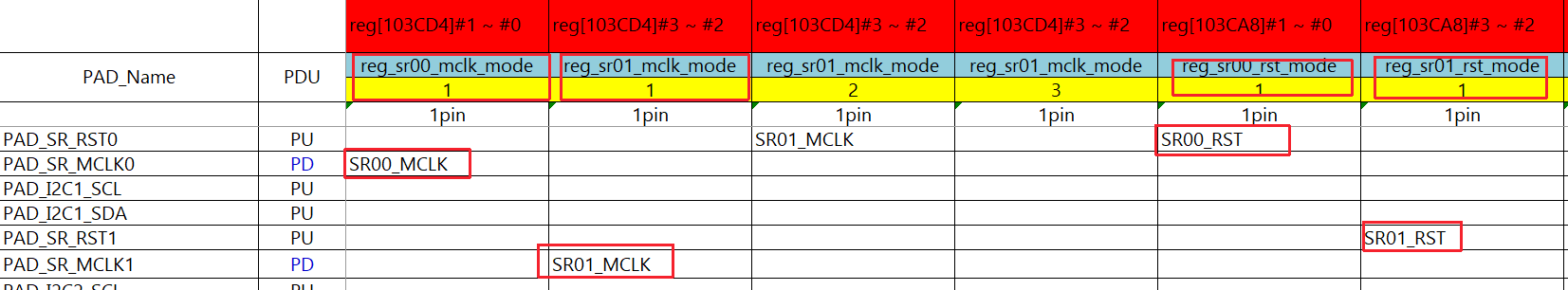 The sensor padmux configuration provides the necessary reset and power down pin voltages for sensor power-up and power-down sequences, ensuring compliance with the sensor's required timing. Additionally, it enables I2C pin configuration between the master and slave devices for reading/writing sensor registers.The sensor padmux supports multiple modes, including MIPI mode, and others. By modifying the active mode, the corresponding pins can be used to transmit data into the IC.
