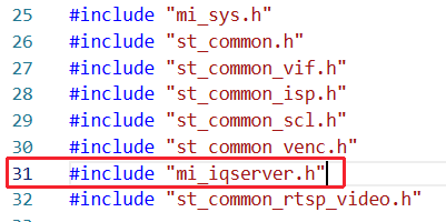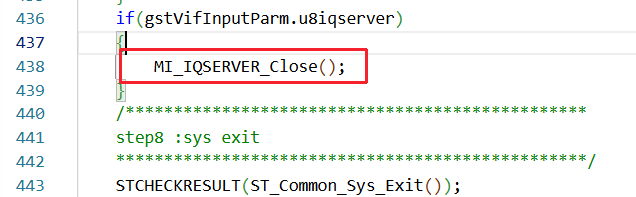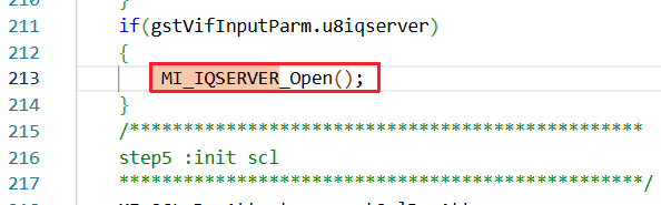sdk/verify/sample_code/source/iford/vif/sensor_demo/st_sample_vif.c, add the IQ Server header file#include "mi_iqserver.h", and includeMI_IQSERVER_Open()in theSTUB_BaseModuleInit()function, andMI_IQSERVER_Close()in theSTUB_BaseModuleDeInitfunction, as shown in the figure below. For specific implementation, please refer tost_sample_vif.c.