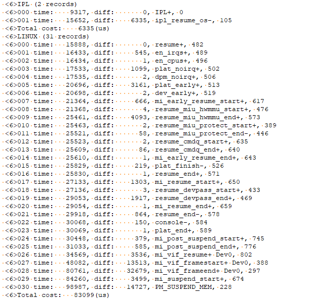 | resume过程耗时 | mi_post_suspend_end+ - resume+ | resume 流程耗时 |