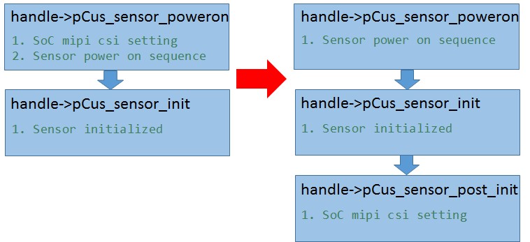 可以通过Sensor驱动句柄初始化函数中的“handle->pCus_sensor_poweron”来控制Sensor上电和复位引脚,如果需要修改Sensor上电时序,请检查Sensor特性和硬件设计。