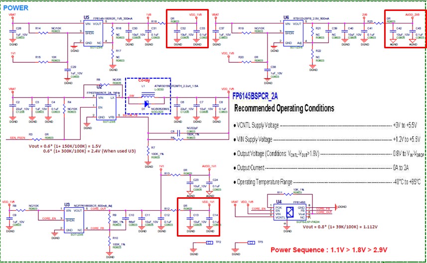 以下是 Sgs Sensor板电源电路原理图。上电后,1.1V、1.8V、2.9V 电源将被拉高。首先是 1.1V,然后是 1.8V 和 2.9V,您可以使用示波器在Sensor板上测量它。