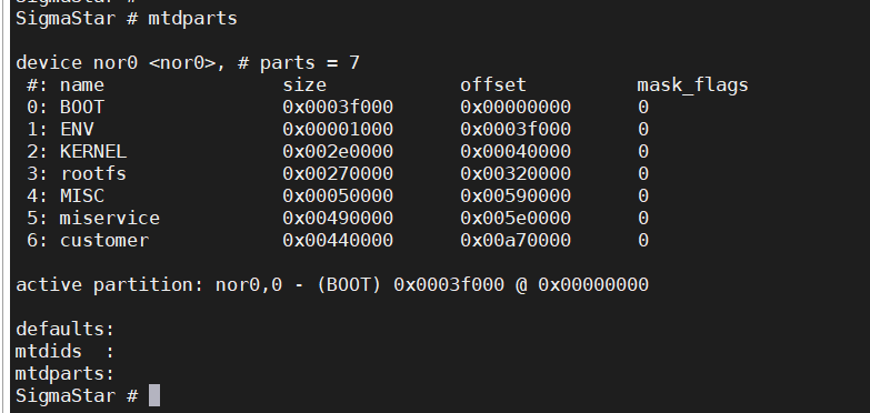 Checksum ok!! IDX: StartBlk: BlkCnt: Trunk/BkTrunk: Group: Active: Name: BUS:CS: 0: 0,(0000000000) 10,(0X00140000) 0/1 0 1 CIS 0:0 1: 10,(0X00140000) 3,(0X00060000) 0/1 1 1 IPL 0:0 2: 13,(0X001A0000) 3,(0X00060000) 0/1 1 1 IPL_CUST 0:0 3: 16,(0X00200000) 7,(0X000E0000) 0/1 1 1 UBOOT 0:0 4: 23,(0X002E0000) 3,(0X00060000) 1/0 2 0 IPL 0:0 5: 26,(0X00340000) 3,(0X00060000) 1/0 2 0 IPL_CUST 0:0 6: 29,(0X003A0000) 7,(0X000E0000) 1/0 2 0 UBOOT 0:0 7: 36,(0X00480000) 2,(0X00040000) 0/0 0 1 ENV 0:0 8: 38,(0X004C0000) 8,(0X00100000) 0/0 0 1 UPDATEFLAG 0:0 9: 46,(0X005C0000) 40,(0X00500000) 0/0 0 1 KERNEL 0:0 10: 86,(0X00AC0000) 40,(0X00500000) 0/0 0 1 KERNEL 0:0 11: 126,(0X00FC0000) 56,(0X00700000) 0/0 0 1 MISC 0:0 12: 182,(0X016C0000) 56,(0X00700000) 0/0 0 1 RO_FILES 0:0 13: 238,(0X01DC0000) 8,(0X00100000) 0/0 0 1 RAMDISK 0:0 14: 246,(0X01EC0000) 8,(0X00100000) 0/0 0 1 RAMDISK_BACKUP 0:0 15: 258,(0X01FC0000) 690,(0X05640000) 0/0 0 1 ubia 0:0