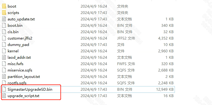 打包完成后将在project/image/output/images目录下生成SigmastarUpgradeSD.bin跟upgrade_script.txt,如下图。将这个两个文件拷贝到SD卡根目录即可。
