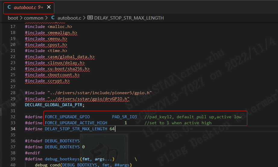 配置指定按键指定状态方法:修改boot/common/autoboot.c下FORCE_UPGRADE_GPIO(指定IO)、FORCE_UPGRADE_ACTIVE_HIGH(指定状态),具体如下图: