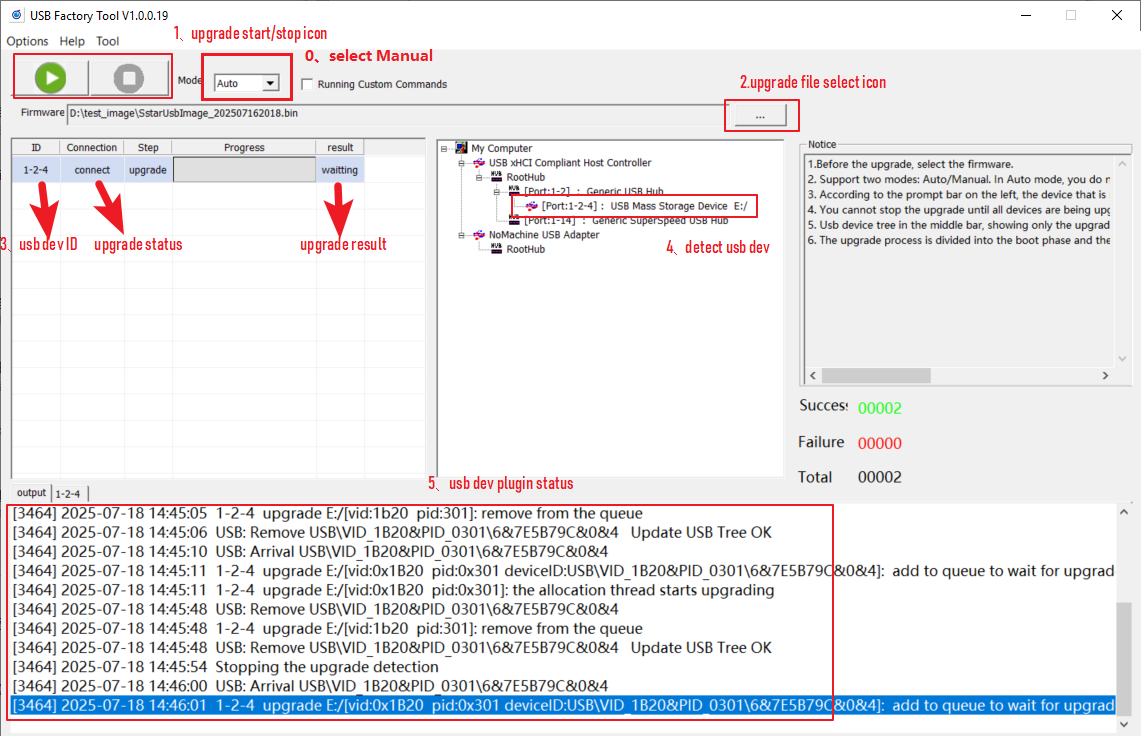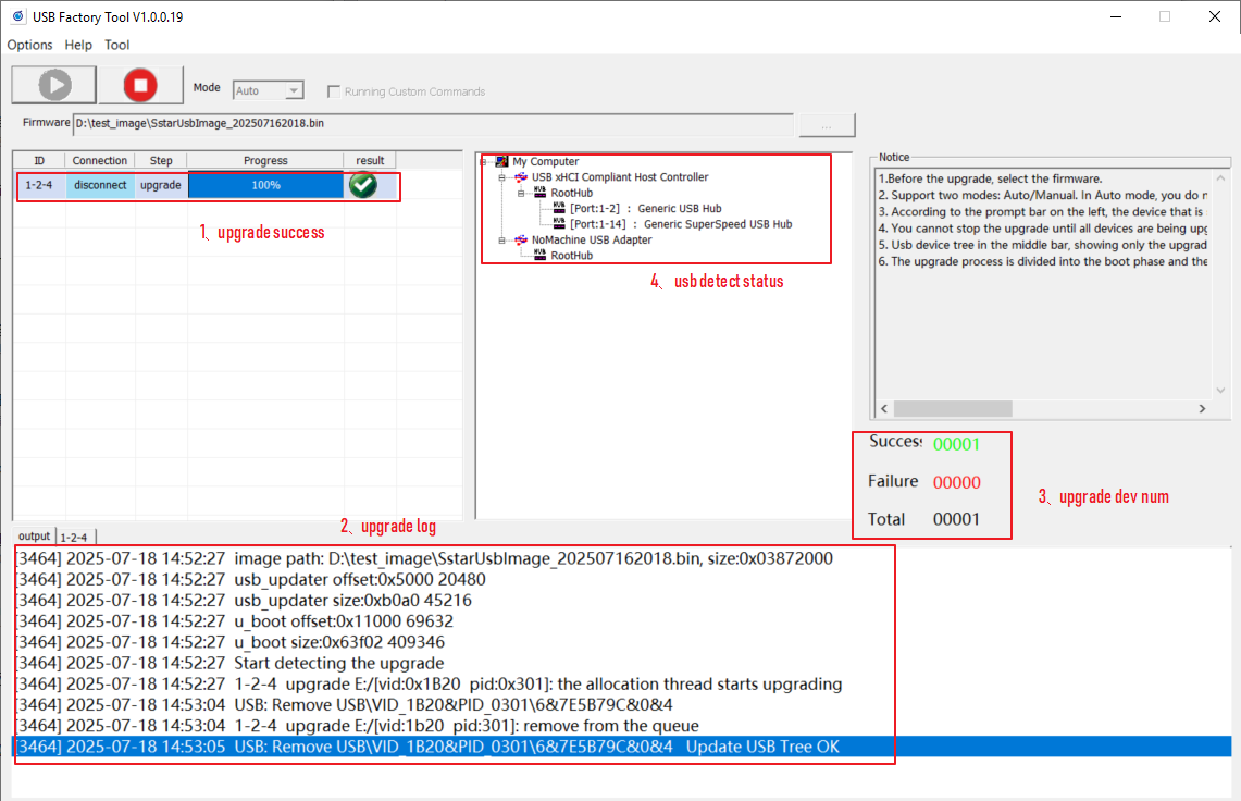 选择好usb升级包文件,等插上的所有设备都识别到后,点击start按钮进行升级,升级完成后的界面如下: