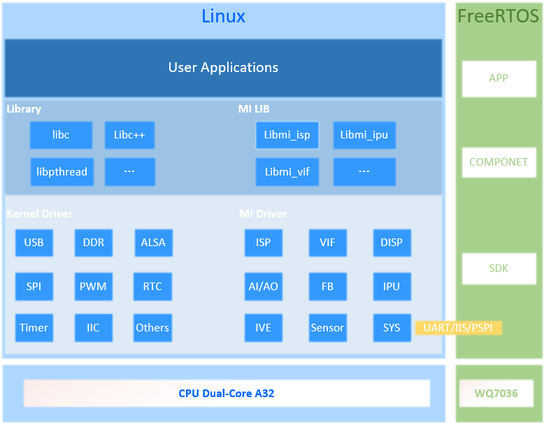 如上图所示 ,ARM端的主控SOC的Linux SDK负责处理 ISP 图像相关功能,蓝牙音频SOC的RTOS SDK负责音频、 蓝牙耳机、电源管理等相关功能,中间数据与命令交互通过UART/IIS/PSPI等接口。