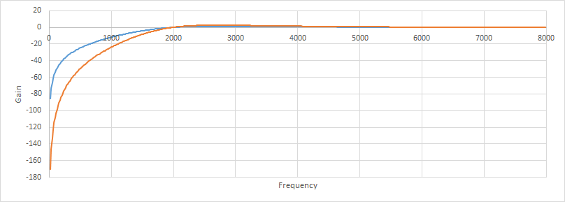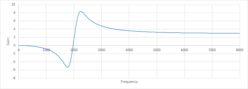 filter_design.q_factor = 1; filter_design.f0 = 2000; filter_design.type = EQ_HIGH_PASS_FILTER; filter_design.gain = 3;画出的频响曲线如下图