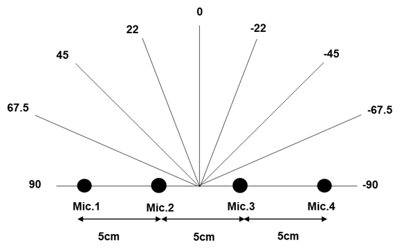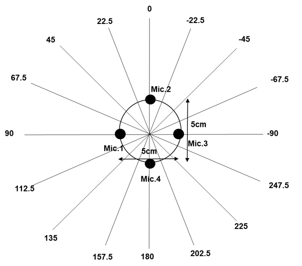 以四颗麦克风为例,如果给定 array_pos:{-4,-2,-1,-3,2,3,4,2},数组中心[X=0.25,Y=0], Mic1[X=-4.25,Y=-2],Mic2 [X=-1.25,Y=-3], Mic3 [X=1.75,Y=3], Mic4 [X=3.75,Y=2]。