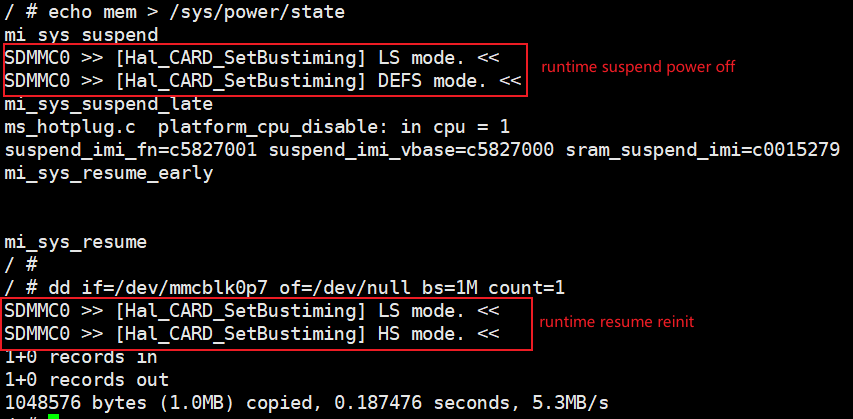 如上图所示,在系统suspend阶段,eMMC会进入suspend状态,并且在真正使用时,才执行resume操作。因此resume阶段的耗时,会延迟到第一次使用时进行。