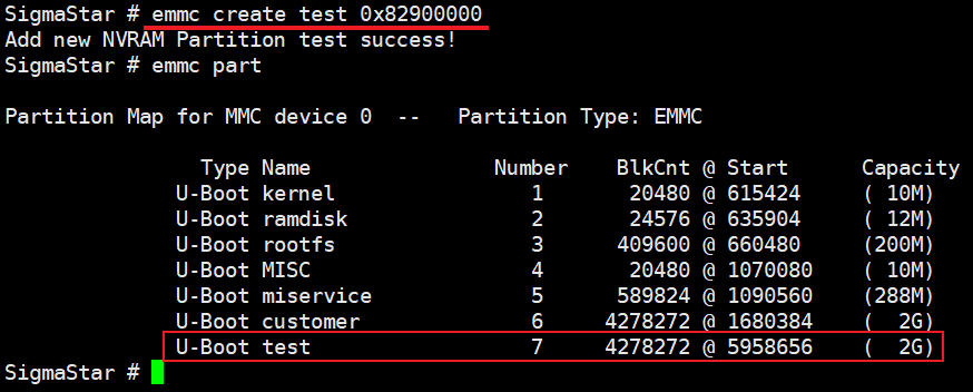 emmc create test 0x82900000 // 创建一个大小为2GB,名称为test的测试分区