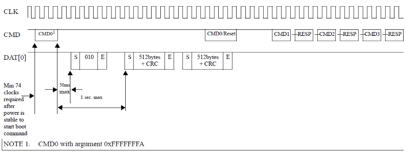 如上图所示,eMMC协议手册规定,cmd0(arg:0xfffffffa)发出到eMMC卡开始发送镜像数据等待周期,最大允许是50ms。