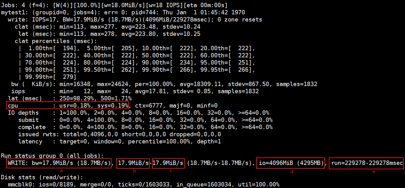 io: 所有线程执行的累计I/O大小(d),四个线程累计写4096MiB(括号内是10的幂的形式)