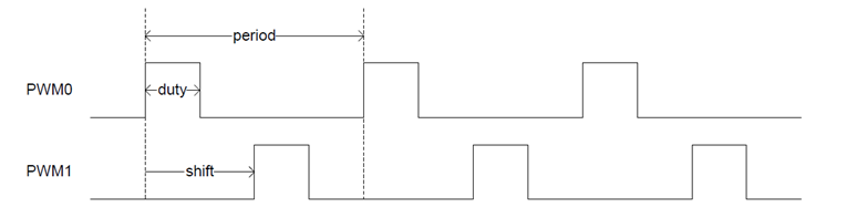 period duty shift PWM0 120Hz 25% 0% PWM1 120Hz 75% 50% PWM的工作频率范围是(OSCCLK/2)到(OSCCLK/2^34),支持的时钟频率和实际工作频率范围如下: