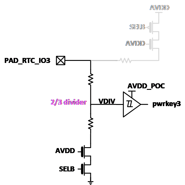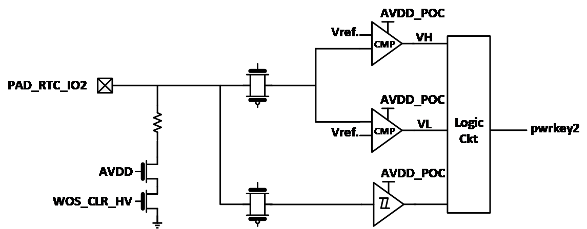 PAD_RTC_IO2可以支持配置内部高压/低压比较器的阈值,此外PAD_RTC_IO2还可以选择连接到内置的施密特触发器上以实现对不同信号捕捉。PAD_RTC_IO2的内部框图为: