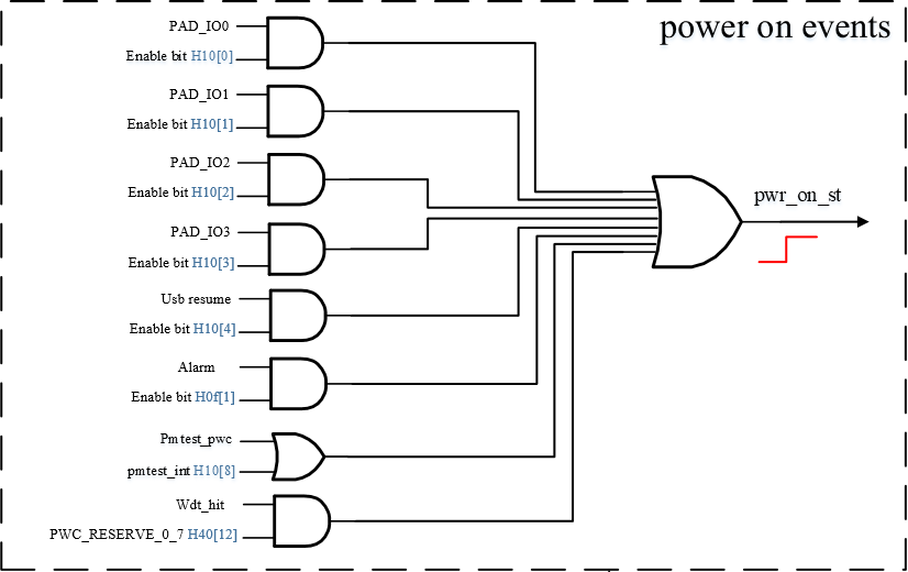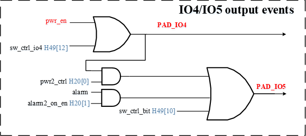 结合图2-2和图2-3可以看到,PAD_RTC_IO0 - PAD_RTC_IO3的事件触发和RTC Alarm的事件触发都可以使power_on_st输出高电平,沿着power_on_st->pwr_en进而拉高PAD_RTC_IO4的电平,同时sw ctrl事件的触发也可以控制PAD_RTC_IO4电平。 从图2-3可以看到PAD_RTC_IO4的电平、RTC Alarm的事件触发和sw ctrl事件的触发都会影响到PAD_RTC_IO5的电平,因此可以灵活利用这些触发事件以及PAD_RTC_IO4和PAD_RTC_IO5的互相作用来实现电源控制,软件上的配置方法详见后文的Kernel用法介绍章节。