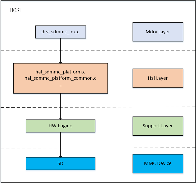 SD host层的整体框架共有三层,分别是MDrv层,Hal层和Support层,以及接在Support层上的MMC设备,各个层次的作用如下: