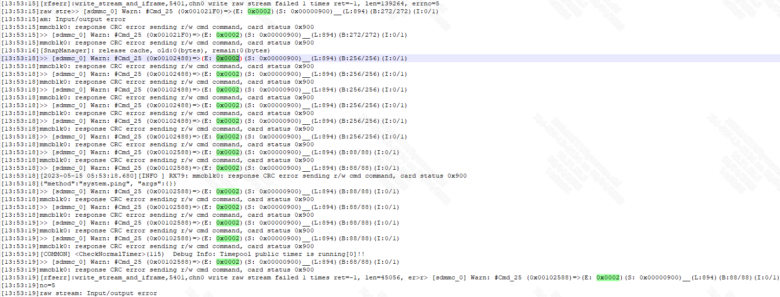 若是在正常读写过程中遇到问题,需要确定是读写超时问题,还是信号不好有CRC问题,区分问题可以通过log确定,超时问题有timeout的字眼,debug方法如下: