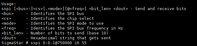 参数 描述 -D 用于选择操作的设备节点,如:/dev/spidev0.0,默认为:/dev/spidev1.1 -s 用于选择spi时钟速率,单位为Hz -H 用于和 -O 搭配选择spi的通讯时序 -O 用于和 -H 搭配选择spi的通讯时序 -C 用于指定CS为高有效 -L 用于指定字节序为LSB -3 用于指定通讯模式为三线模式 -v 用于指定打印出发送&接收的数据内容 -i 用于指定发送的文件(二进制文件) -o 用于指定接收的数据保存成文件的路径(二进制文件) -p 用于指定发送的数据,如:“1234\xde\xad” 当前驱动所支持的功能上表所列,具体的使用方法可以参考help命令: