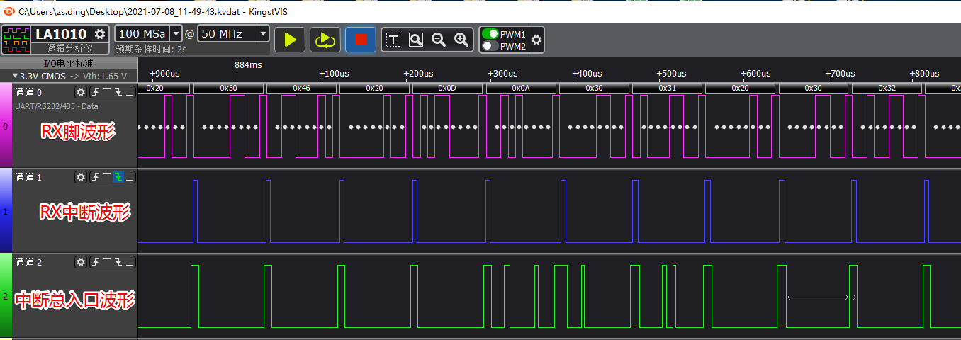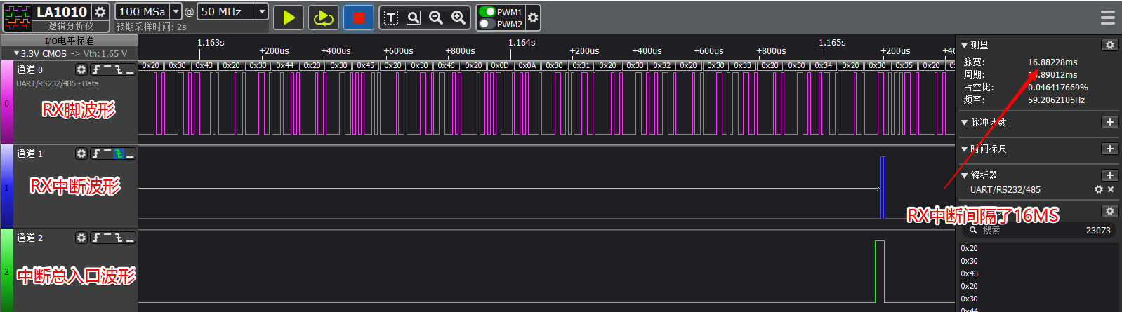 2、UART出中断的时候恰好Linux中断被关了(spin_lock_irqsave等),这样UART的中断也会被延时处理。一般都是第二情况导致的RX接收数据丢失,只有在波特率很高时才会遇到第一种情况引起UART RX丢数据。可以通过在UART中断和Linux中断处理入口处拉选取的GPIO来确定,用LA抓UARTRX和选取的GPIO波形。正常情况的波形如图7-2,可以看到RX脚接收到一个Byte数据就会唤醒一次RX中断将FIFO中数据取走,出错的情况如图7-3,这时候RX中断间隔了16MS才被唤醒一次,我们硬件的RX FIFO长度是32Byte,在典型的115200波特率的情况下不间断接收数据只要2.78ms中断没有被处理就会因为FIFO满而丢数据,所以只要系统中存在超过2.78ms以上的关中断理论上就会引起UART接收丢数据。