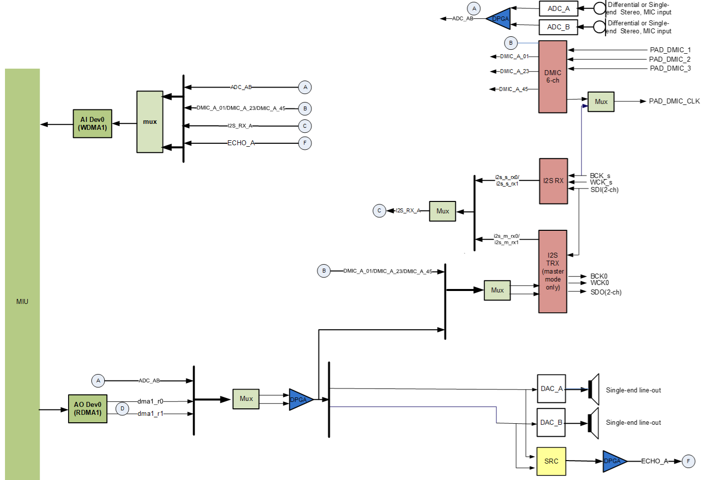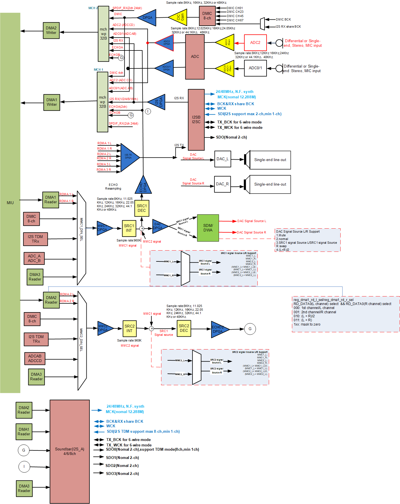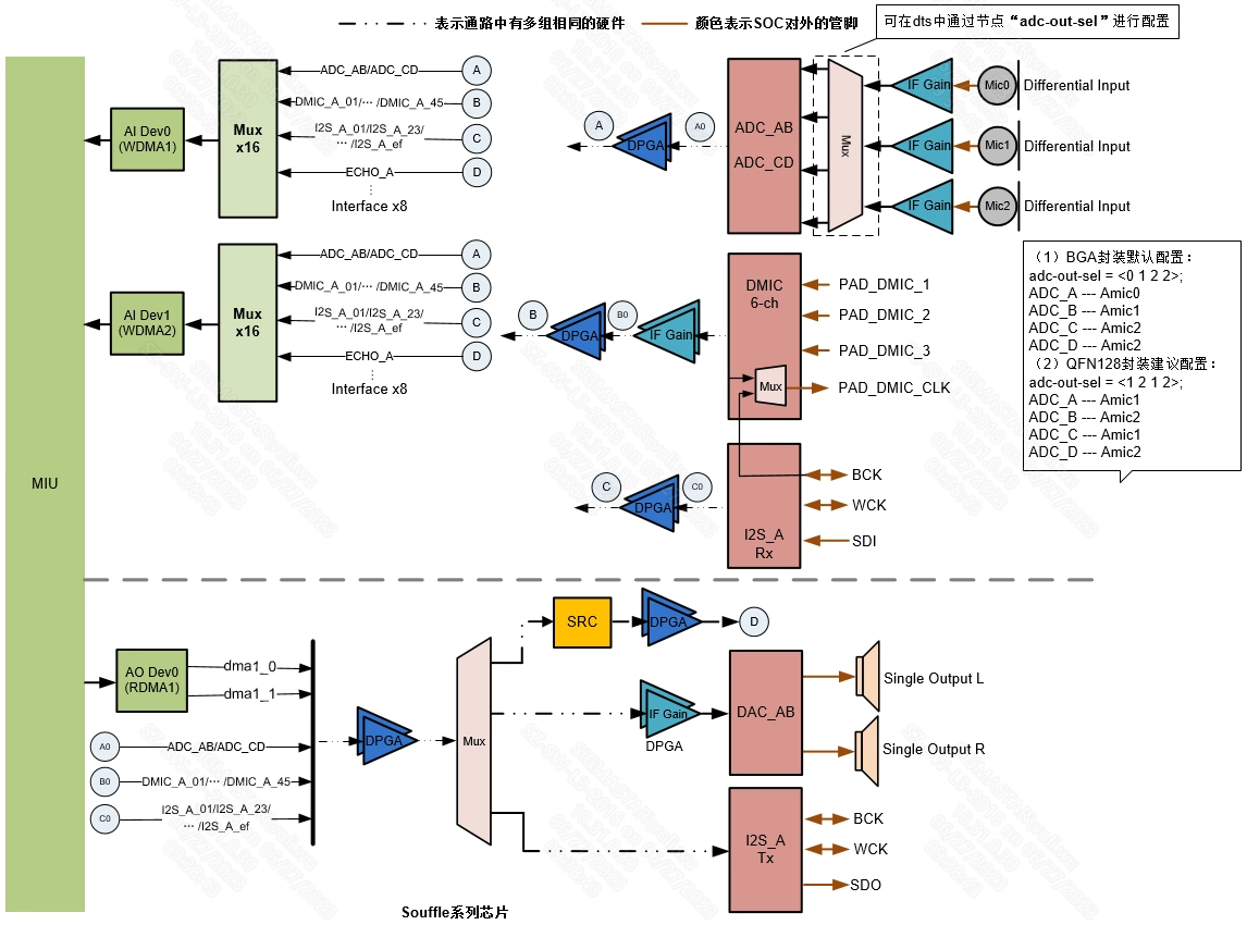 MUX即multiplexer 数据选择器,在多路数据传送过程中,能够根据需要将其中任意多路选出来的电路。WDMA前面的Mux为WDMA选择多个数据数据源,可支持选择1/ 2/ 4个数据源(数据源可以相同也可以不同,Souffle系列芯片最大支持选择8个数据源16Chn),每个数据源各有两声道,即选择2/ 4/ 8/ 16个声道的数据由WDMA写到DRAM(除了Souffle系列芯片支持16声道外,其他系列均最大支持8个声道),起到多路开关的作用。而接近输出外设接口(如I2S TX/HDMI/DAC等)的Mux实现的是多选一或一选多的作用。