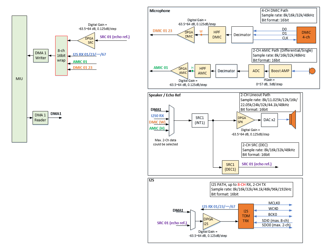 AI的Gain在audio3.0架构上分成两类,一类是与Device相关联的Gain,一般由DPGA实现,另一类则是Interface所独有的Gain,目前拥有Gain的Interface有ADC以及Dmic接口。对于AI而言,若Interface本身没有独立的Interface Gain且也不与Dpga相连,则没法做Gain的设定,具体见芯片Codec框图。
