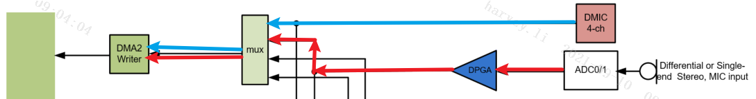 下图是将Dmic和ADC Attach到WDMA2的结果,MUX选择Dmic和ADC0/1作为两个数据源,并连接到WDMA2,这样WDMA2就能收到来自Dmic和ADC0/1的数据。