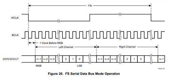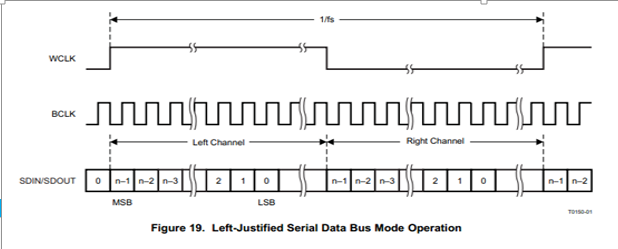图1‑14:I2S Left-justified对齐格式 I2S Philips的对齐格式,样本数据的第一个数据位出现在WCLK(即左右通道切换时钟)跳变的第一个BCLK(即串行时钟)后。左对齐格式,样本数据的第一个数据位出现在WCLK(即左右通道切换时钟)跳变的第一个BCLK(即串行时钟)内,且WCLK的极性与I2S Philips的对齐格式相反。